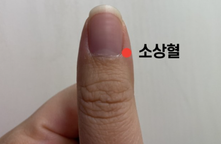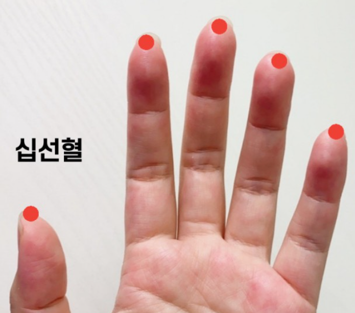 소상혈을 따줍니다. 좀 더 심하면 십 선혈인 손가락 열개에 존재하며 손톱 안쪽 가운데 부분을 따는 경우도 있습니다.