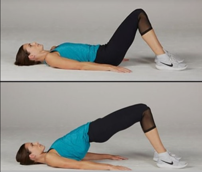 1) 등을 대고 누워서 무릎을 구부리고 발을 바닥에 붙어 엉덩이를 들어 올리는 운동입니다.